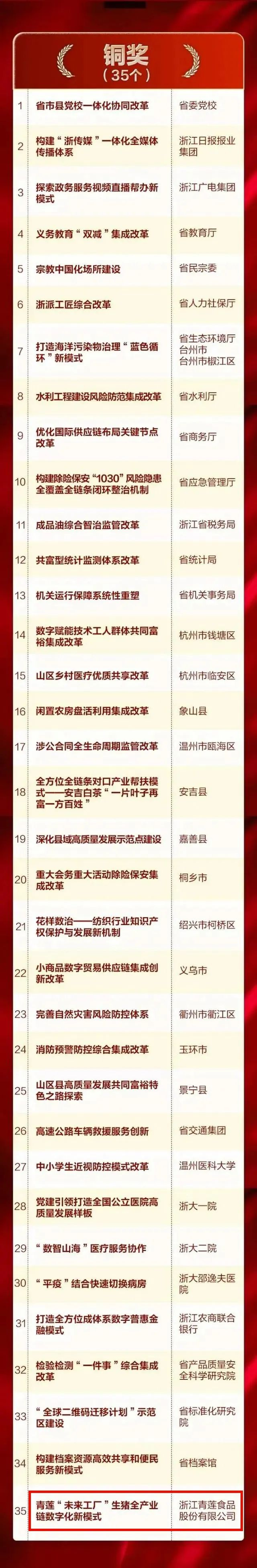 重磅!青蓮食品—膳博士榮獲浙江改革突破獎銅獎! 2023-02-01 09:20:19 浙江青蓮食品股份有限公司 瀏覽次數 1799 近日,浙江省委改革辦公布了2022年度浙江省改革突破獎名單。浙江青蓮食品股份有限公司“數智青蓮”未來工廠榮獲2022年度浙江省改革突破獎銅獎,是銅獎組中唯一的一家民營企業。20多年來,青蓮食品構建起從農場到餐桌的透明全產業鏈,在改革創新中以種業為源頭,建立起未來農場—未來工廠—產業新零售等數字化應用,真正從用戶需求出發為社會提供優質食品!此次獲得浙江改革突破獎銅獎,更是對青蓮食品數字化轉型成果的肯定和勉勵!實現黑豬專家膳博士在安全和美味雙升級上硬核突破!身為黑豬專家,膳博士服務過世博會、世乒賽、國際馬拉松比賽,連續8年為世界互聯網大會供肉,連續14年為中國極地研究中心供肉,成為杭州亞運會官方生鮮肉類產品供應商。以國家級嘉興黑豬和兩頭烏保種場作為種業基礎繁育國家級優質新品種,形成完整的黑豬商品體系為消費者帶來舌尖體驗。近年來,通過智慧養殖為傳統畜牧產業數字化轉型先行探路,以新一代信息技術為手段,重塑生豬全產業鏈生產組織方式和管理服務模式,構建“1+4+N”模型,推動全產業鏈數字化轉型。產業零售端以用戶需求為中心持續推出膳博士黑豬鮮肉鮮制系列產品提升消費體驗,滿足國人對美好生活、品質食品的向往。2022年,青蓮智慧牧場首批入選浙江省“未來農場”,“數智青蓮”未來工廠獲全省數字化改革“最佳應用”和全省數字經濟系統“最佳應用”。在全省數字化改革大會上做匯報演示,列入全省數字經濟系統地方特色應用目錄,受到央視、省級、市縣級等媒體持續關注報道。 上一條“風云浙商”許明曙:人生把一件事做好就很不容易 下一條全國唯一!膳博士·香雪白豬獲2022年度國家新品種認定!