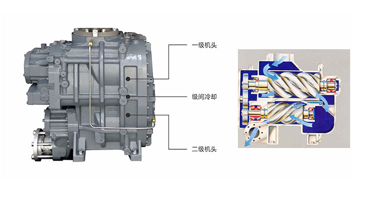 采用立體霧簾中間風(fēng)冷降溫,實現(xiàn)了近似等溫,等壓比壓縮,比單級永磁變頻機組功率更低10-15%.