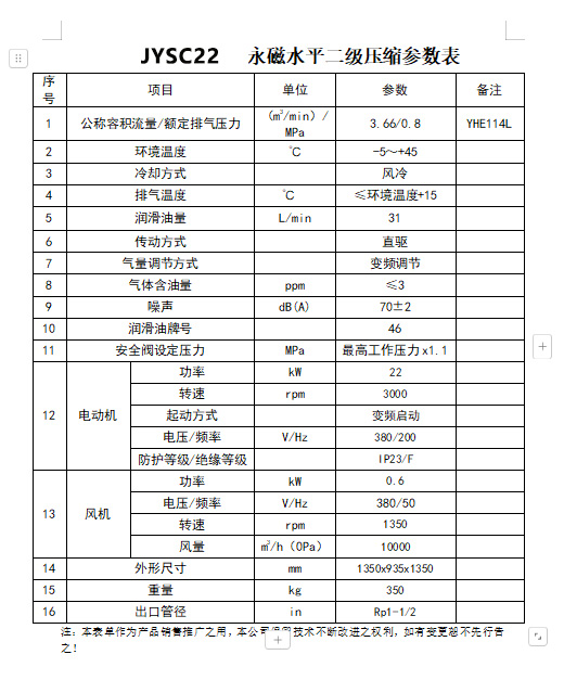 產(chǎn)品名稱(chēng):22kW 水平雙級(jí)直連永磁變頻空壓機(jī) JYSC22