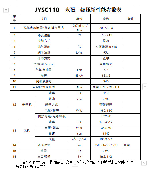 產(chǎn)品名稱:110kW 水平雙級直連永磁變頻空壓機(jī) JYSC110