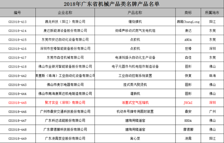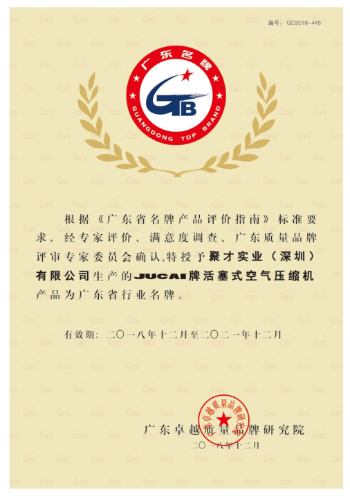 喜訊——根據(jù)《廣東省名牌產(chǎn)品評價指南》標準要求,在企業(yè)自愿申報的基礎上,經(jīng)申報資料初審、審報數(shù)據(jù)公示、企業(yè)現(xiàn)場審查、專家綜合評價、廣東質(zhì)量品牌評審專家委員會審議確認,授予聚才實業(yè)(深圳)有限公司生產(chǎn)的“JUCAI聚才”牌活塞式空氣壓縮機等系列產(chǎn)品為2018年度廣東省行業(yè)類名牌,有效期三年。