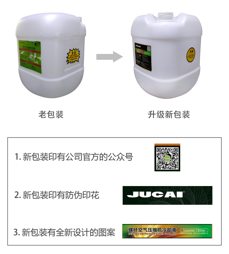 此冷卻液是專為JUCAI螺桿空氣壓縮機研制的合成潤滑油,油品性能及其穩(wěn)定。因品牌持續(xù)強大,產(chǎn)品持續(xù)火紅,調(diào)查發(fā)現(xiàn)有不法分子仿冒JUCAI品牌產(chǎn)品螺桿空氣壓縮機冷卻液,為保障消費權(quán)益,樹立更好的品牌形象,公司絕對嚴厲打擊仿冒。公司在經(jīng)過交流溝通后,特將包裝做統(tǒng)一調(diào)整,并從2019年1月份新包裝開始陸續(xù)推出,屆時請各位顧客留意并及時關(guān)注。具體包裝形象更改如下: